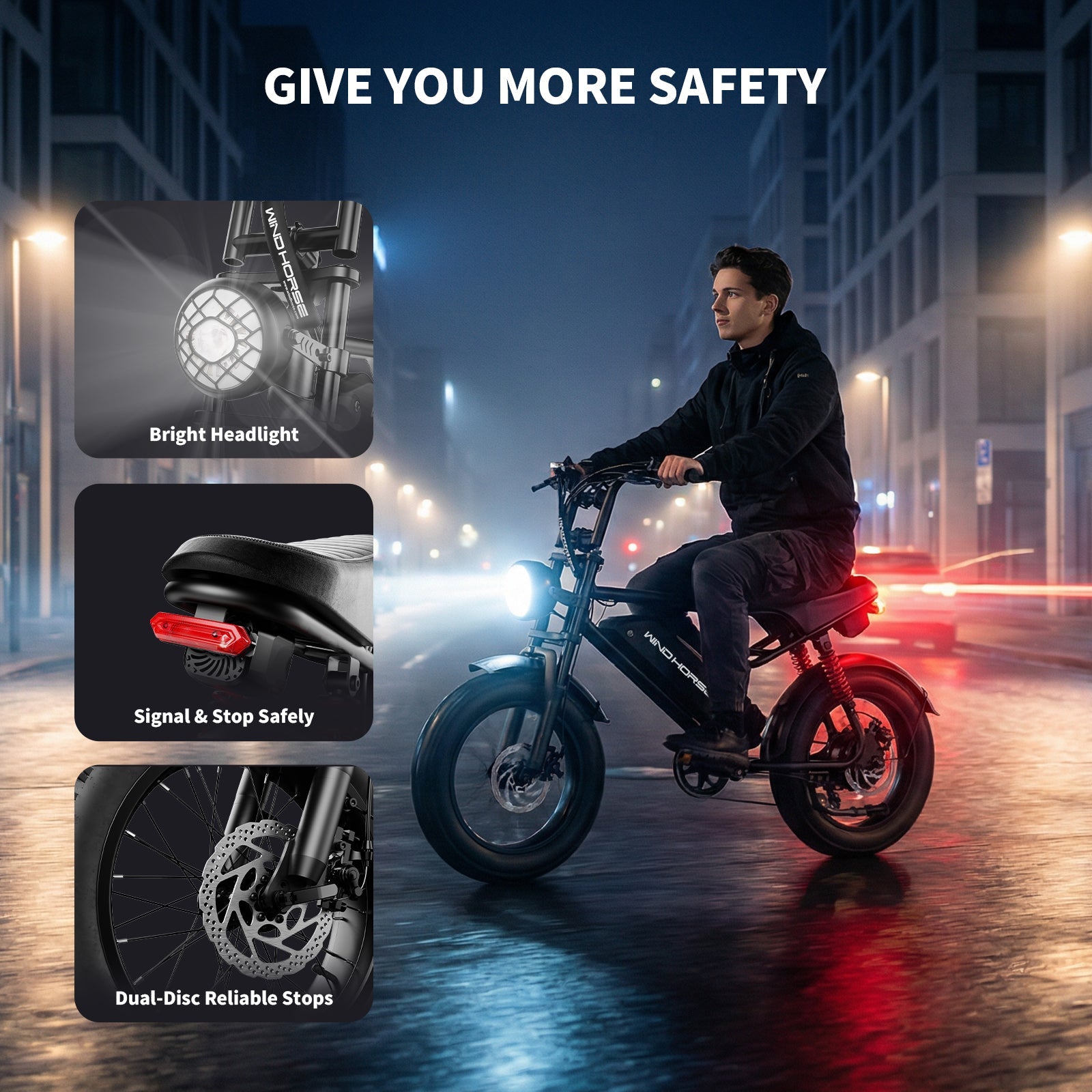 The full suspension system with dual shock absorption absorbs bumps, rocks, and rough terrain with ease. Whether you're riding city streets or off-road trails, it delivers a smoother ride, better stability, and greater control — so you can ride longer with less fatigue and more confidence.