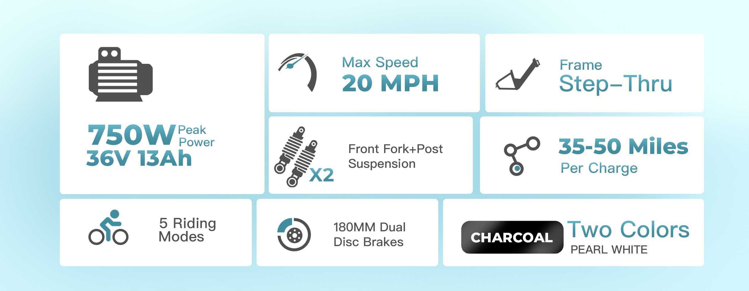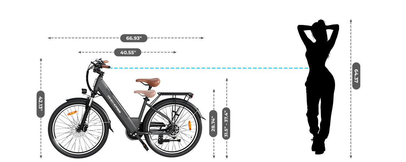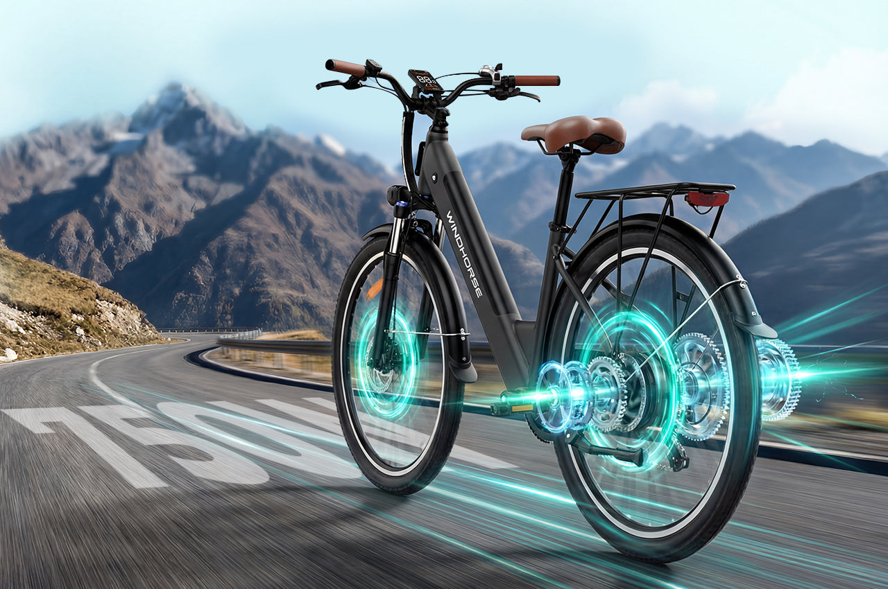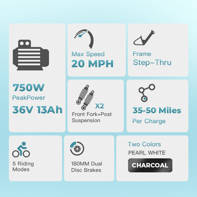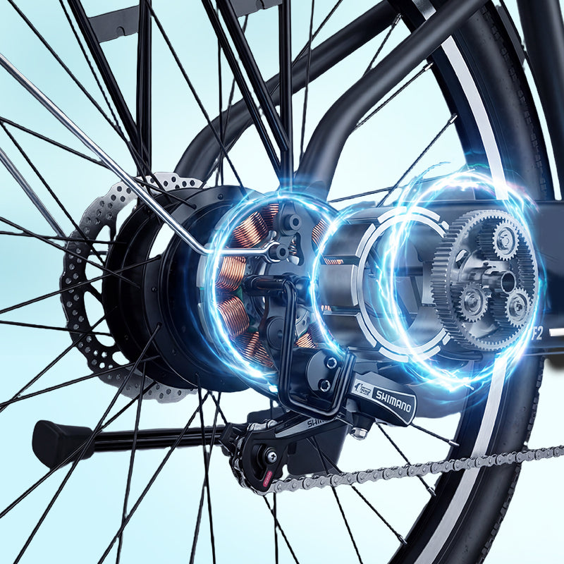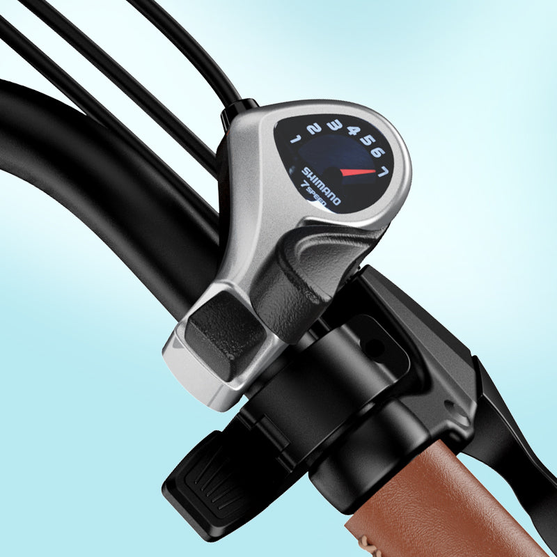 Powered by a smooth and efficient 350W electric bike motor (750W peak), this 20 mph electric bicycle offers responsive acceleration and confident hill climbing. With 5 working modes, 3 pedal-assist levels, Shimano 7-speed gearing, front suspension, dual disc brakes, and integrated lights, this city electric bike is designed for comfort, control, and everyday performance.