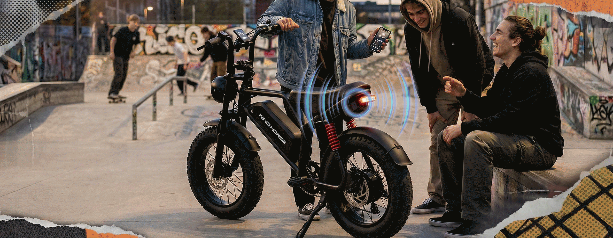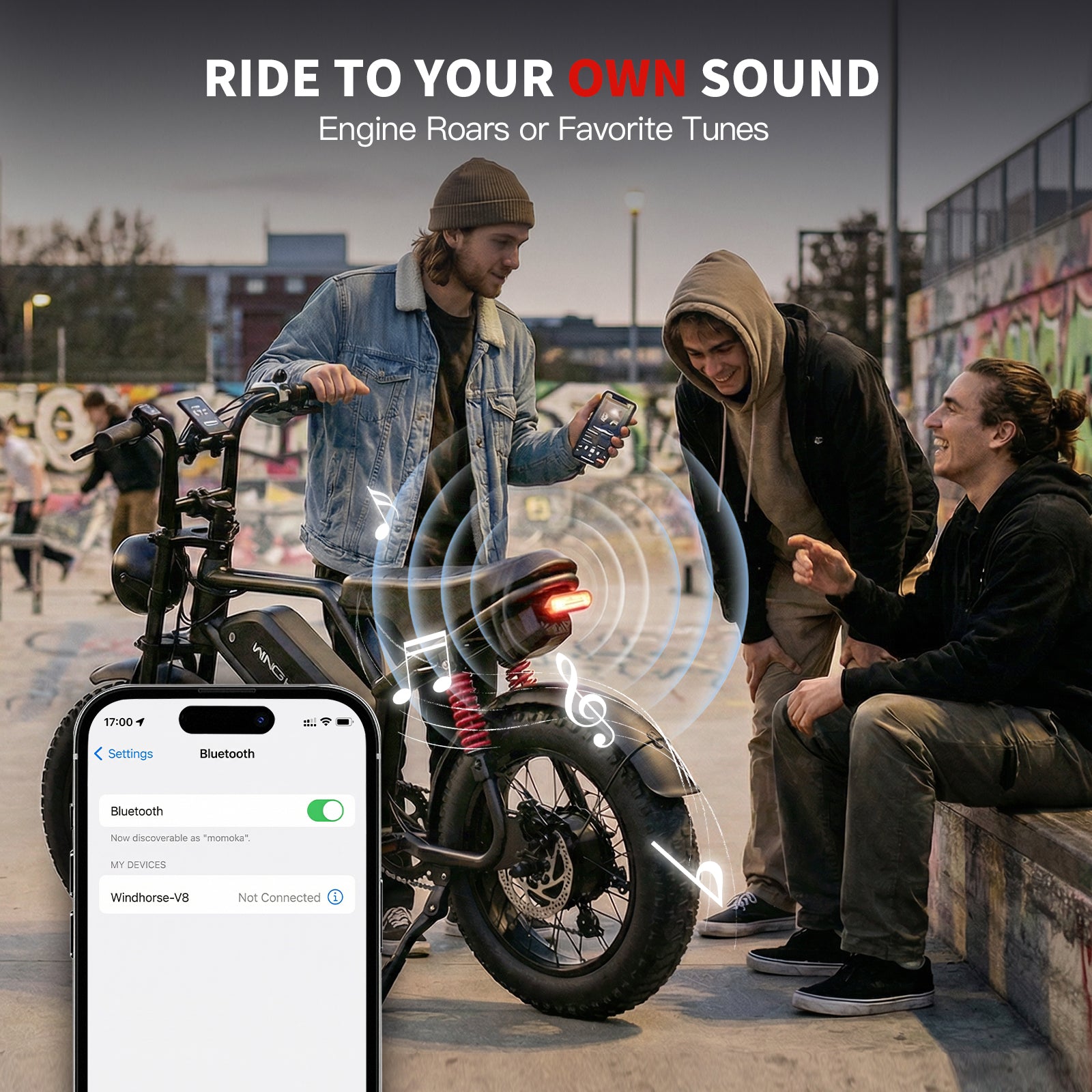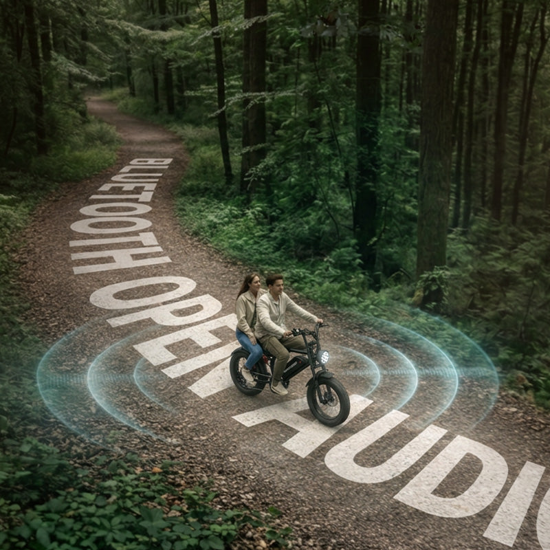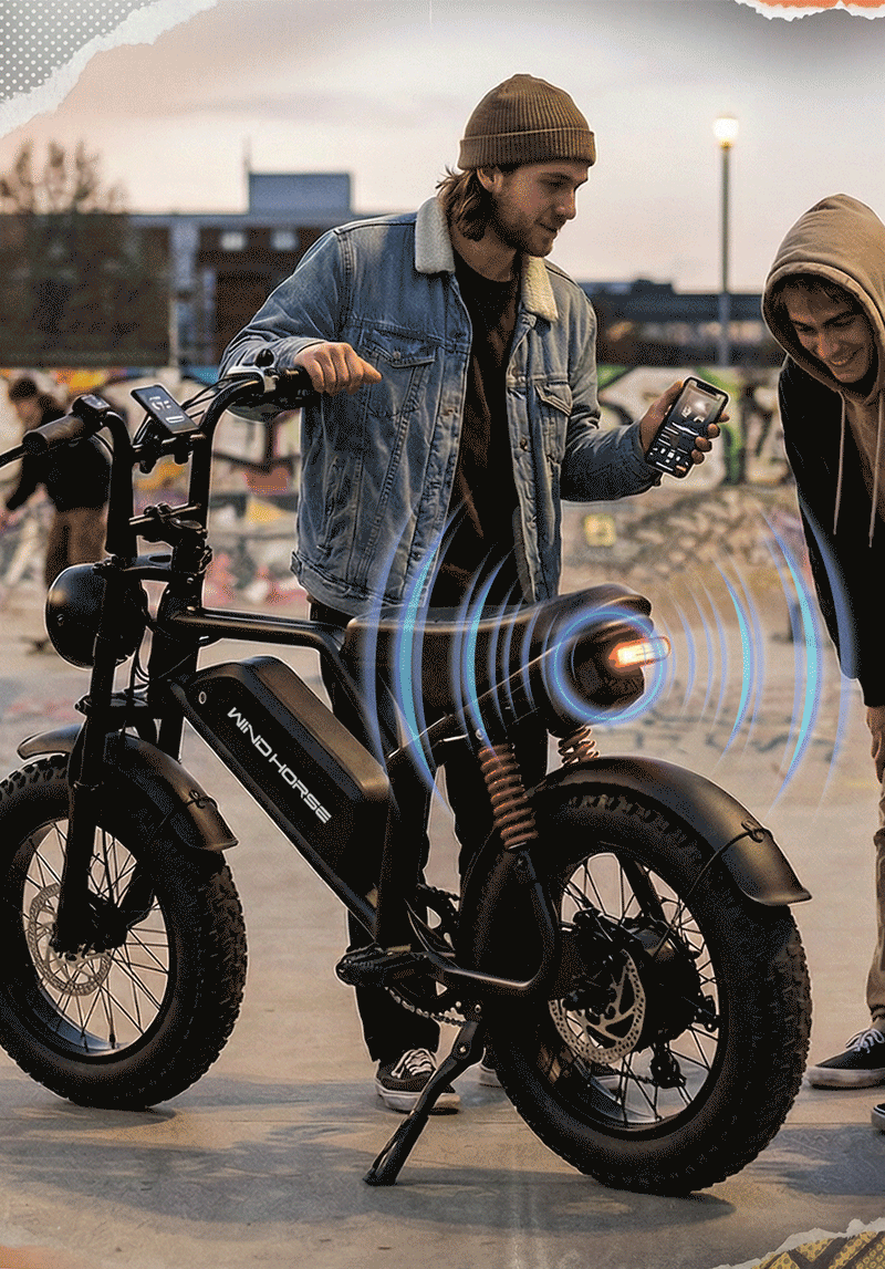 Bluetooth speaker with throttle-reactive engine sound (73–82 dB) for a real moto vibe. Turn it off for quiet rides. High-intensity headlight, brake light, and turn signals keep you safe.